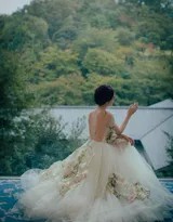 以淡雅色丝线绣出的缠枝花卉与藤蔓纹样,沿着裙身蜿蜒绽放,既保留了传统刺绣的细腻精巧,又通过疏密有致的布局避免了厚重感,与纱的轻柔相得益彰。这种设计巧妙地将古典韵味与现代审美结合,既显华美又不失仙气。